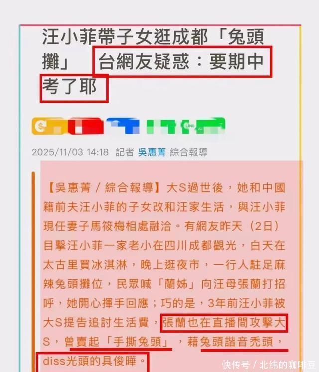 秋高气爽气温宜人,恰逢孩子们放假,祖孙三代难得相聚,同游成都,画面温馨有爱,网友们纷纷为这坎坷多磨的一家人送上祝福。 台媒看到这个画面,却发出了不同的声音。 台媒新闻标题是:汪小菲带子女逛成都兔头摊,台网友疑惑:要期中考了耶。